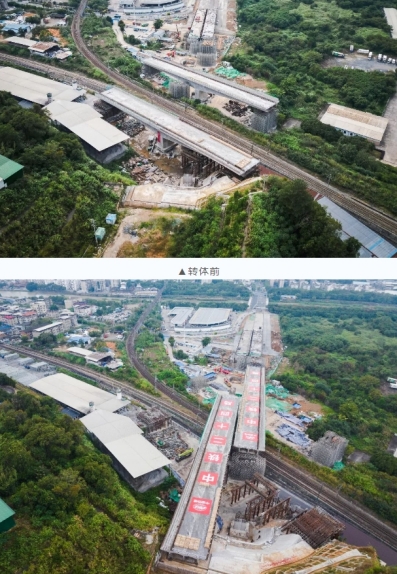 當(dāng)天7時(shí)04分,轉(zhuǎn)體橋梁開(kāi)始轉(zhuǎn)體,經(jīng)過(guò)44分鐘施工,成功完成高空“二人轉(zhuǎn)”,為下一步順利實(shí)現(xiàn)通車(chē)運(yùn)營(yíng)奠定堅(jiān)實(shí)基礎(chǔ)。轉(zhuǎn)體橋上跨既有漳龍線、龍東線及煤場(chǎng)專用線3條鐵路貨運(yùn)營(yíng)業(yè)線,距離營(yíng)業(yè)線最近距離僅5.9米,施工難度大,危險(xiǎn)系數(shù)高。