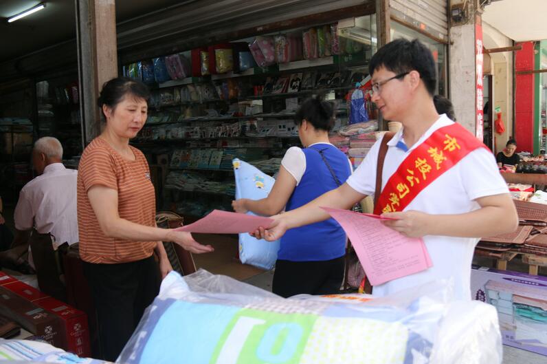 志愿者向居民和商業(yè)店鋪發(fā)放宣傳資料《創(chuàng)建全國文明城市倡議書》《創(chuàng)建全國文明城市應(yīng)知應(yīng)會知識》《創(chuàng)建全國文明城市知識問卷》,向居民和商業(yè)店鋪講解了“創(chuàng)城”的意義,并與執(zhí)法大隊人員一起對沿街不規(guī)范的店鋪進(jìn)行整改。